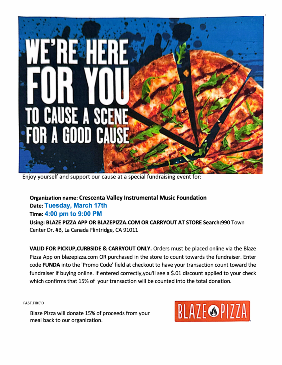 DINE OUTBLAZE PIZZA – TUESDAY 3/17 4-9PM